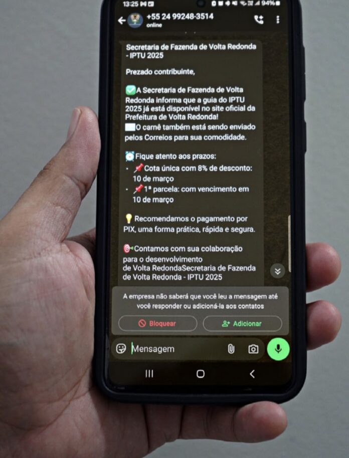 Os números oficiais utilizados são: (24) 99248- 3514, (24) 99971-7902, (24) 3511-3375 e (24) 3511-3274 e, por eles, estão sendo enviadas comunicações fiscais importantes. A SMF orienta que qualquer mensagem recebida de outros números deve ser considerada suspeita. “Nunca compartilhe seus dados pessoais ou financeiros com números desconhecidos e, caso receba alguma mensagem suspeita, entre em contato imediatamente com a Secretaria de Fazenda para confirmação”, alerta. A pasta lembra que os números de telefone fixo (24) 3511-3375 e (24) 3511-3274 também recebem ligações. “Já os números de celular só recebem mensagens pelo WhatsApp”, explicou Aline Fernandes, acrescentando que, além do IPTU, os canais oficiais t a m b é m informam sobre serviços como programas de r e g u l a r i z a ç ã o fiscal, como o Refis.