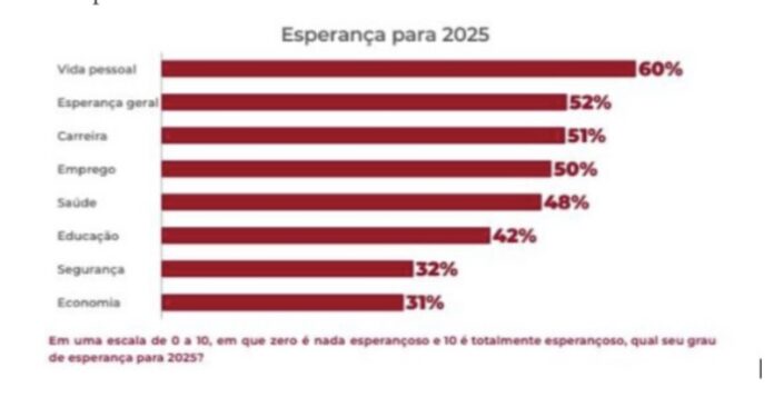 O consumidor brasileiro é mais otimista com sua vida pessoal e carreira quanto aos rumos da economia e segurança do país. É o que aponta a pesquisa ‘Expectativas e Esperanças’, realizada pelo Centro de Estudos Aplicados de Marketing (CEAM) da ESPM, escola de referência, autoridade em Marketing e Inovação voltada para negócios. O levantamento analisou a esperança do consumidor brasileiro para interesses individuais e aspectos da sociedade em 2025, considerando mudanças sociais, políticas, econômicas e ambientais que impactam diretamente como as pessoas enxergam o futuro. Ao perguntar sobre o grau de esperança para vida pessoal, os respondentes se mostram mais confiantes neste quesito, com 60% de esperança, ocupando o primeiro lugar.