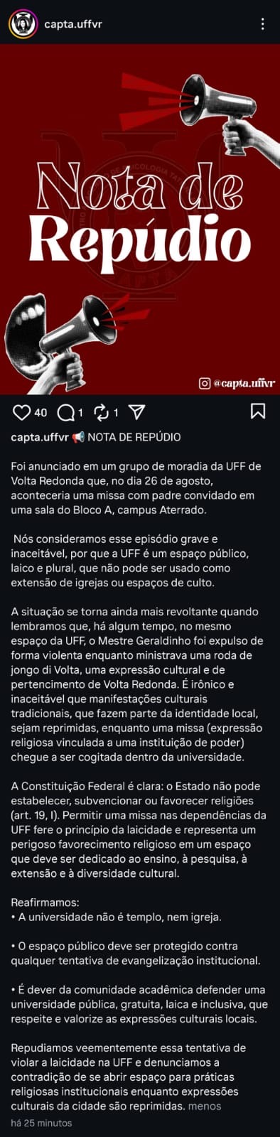 A publicação, disponível na página do Capta-UFF no Instagram, diz ainda que recentemente um representante do Candomblé teria sido expulso do mesmo campus, de forma violenta, enquanto ministrava uma roda de jongo di volta. “Permitir missa na UFF (…) representa um perigoso favorecimento religioso em um espaço que deve ser dedicado ao ensino, à pesquisa, a extensão e à diversidade cultural”, concluiu.