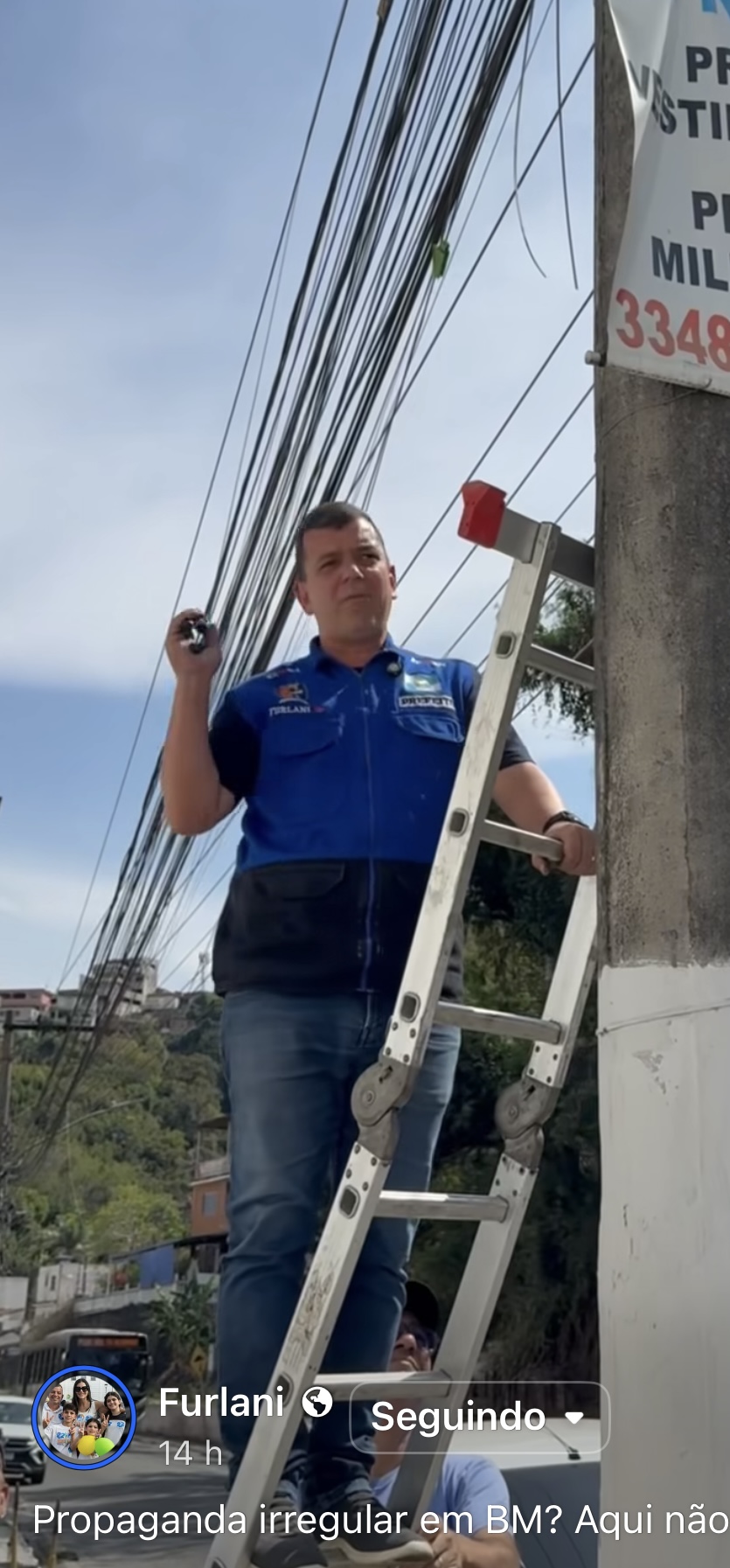Risco – Luiz Furlani, o prefeito Tik Toker de Barra Mansa, voltou a atacar. Primeiro ao subir em uma escada, na Avenida Major José Bento, sem qualquer proteção, para, literalmente, arrancar um galhardete de propaganda de um poste da rua. Que a propaganda era irregular, não se discute. Inclusive a multa, de R$ 400, foi bem aplicada à empresa responsável pela ‘porcalhada’. O perigo era Furlani cair ou encostar em algum fio da rede elétrica.