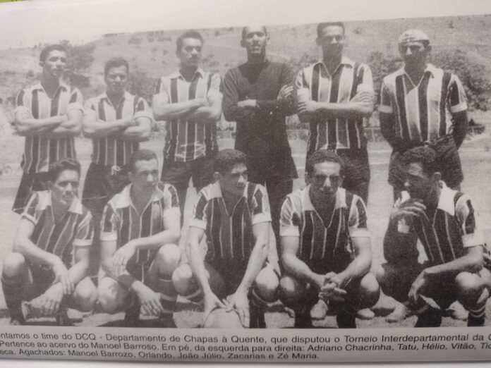 Apresentamos o time do DCQ – Departamento de Chapas à Quente , que disputou o Campeonato Interdepartamental da CSN. Pertence ao acervo do saudoso Manoel Barroso. Em pé da esquerda para a direita: Adriano Chacrinha, Tatu, Hélio, Vitão, Tio Quinca e Careca. Agachados: Manoel Barroso, Orlando, João Júlio, Zacarias e Zé Maria.