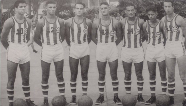 A foto é da seleção de basquete da LDVR – Liga de Desportos de Volta Redonda – tirada em 195, na quadra do Clube Umuarama. Pertence ao acervo do saudoso Libiano Abiatti. Da esquerda para a direita: Ávila, Moub, Zé Machado, Carlos Paes, Rubens Paz e Libiano.