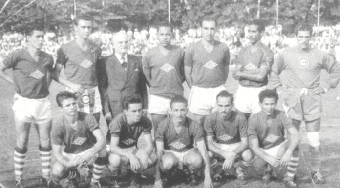 Esta é a seleção de Volta Redonda de 1954, com uniforme da CSVR/CSN – Contabilidade Seccional de Volta Redonda. O acervo é de Vicente Melo.