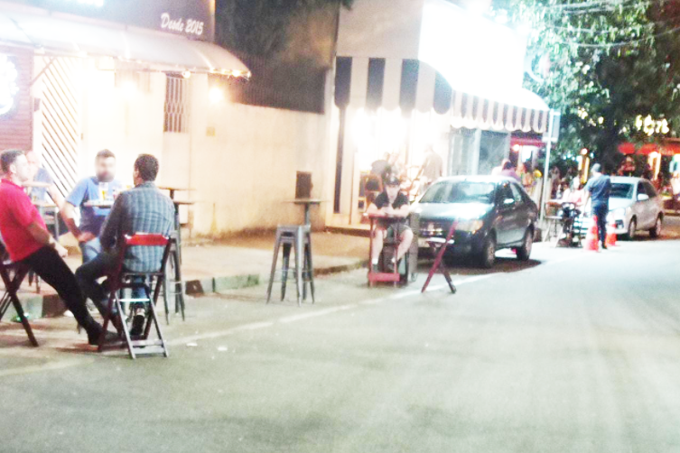 Ele está certo. Na noite de quinta, 18, cinco bares estavam utilizando as vagas de estacionamento como extensão das suas casas. Tem mais. Na praça, os locais demarcados para as mesas e cadeiras também não eram respeitados. Ocupavam até a área do parquinho – com brinquedos, em sua maioria, quebrados. Como as calçadas também passaram a ser ocupadas desordenadamente, os pedestres são obrigados a andar pelas ruas.