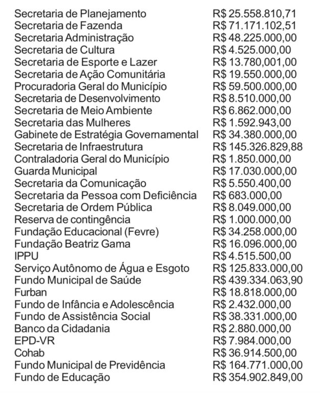 Em termos práticos, a LOA serve para que o Poder Público possa saber de onde virão as receitas financeiras e como elas serão usadas. O setor que mais recursos terá no ano que vem será o da Saúde: R$ R$ 439.334.063,90. O segundo é o de Educação, com R$ 354.902.849,00. Outras pastas, entretanto, ficarão à míngua, como a secretaria da Mulher, que terá apenas R$ 1,5 milhão para o ano que vem. Pior ainda é a secretaria das Pessoas com Deficiência, que contará com irrisórios R$ 680 mil na comparação com o valor total.