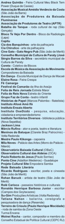 Nos discursos, houve espaço também para pedidos de mais apoio à cultura que se faz na periferia. Criador do ‘Ponto Cine’, em Guadalupe, na zona Norte da cidade do Rio, Adailton Medeiros falou sobre a dificuldade que enfrentou com o projeto. “É a primeira sala digital popular do país e a segunda do mundo; já exibiu mais de 600 filmes para mais de 800 mil pessoas, mas hoje está fechada e teve a energia elétrica cortada. É um projeto premiado, que deslocou o bairro das páginas policiais para as colunas culturais. Perdemos patrocinadores e não conseguimos o apoio de órgãos de cultura do estado e do município nos últimos anos”, contou.