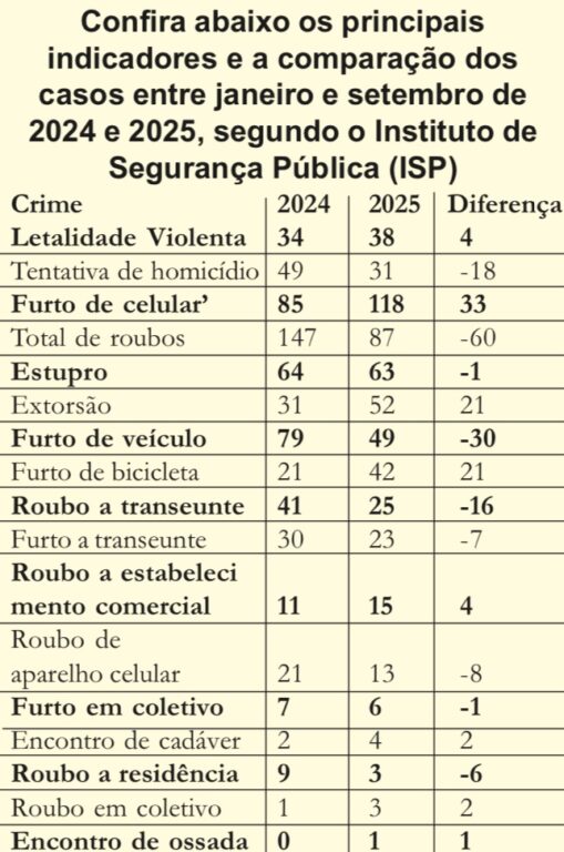 Apesar da alta em vários indicadores, a Secretaria de Ordem Pública comemora os números apresentados pelo ISP, afirmando, entre outras, que o mês de setembro terminou “com boas notícias”. De fato, alguns crimes registraram queda: o roubo de veículos caiu 60% (de 25 para 10 casos), o roubo de rua teve redução de 35% (de 63 para 41), o furto de veículos diminuiu 39%( de 75 para 46) e o furto a transeuntes recuou 24% (de 29 para 22).