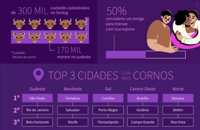 Uma boa parcela dos municípios brasileiros tem, pelo menos, um corno [3]. Segundo o último levantamento do Sexlog, baseado nos cadastros que assinalaram esse fetiche como uma de suas preferências, eles são 334.230, espalhados por 2.321 cidades. O Sudeste lidera como a região com mais cornos assumidos, eles são 171.129. As #5 cidades com mais cuckolds são as de São Paulo, Rio de Janeiro, Belo Horizonte, Campinas e Uberlândia. Veja abaixo a quantidade de cuckolds nas cidades da região, conforme levantamento feito pelo Sexlog a pedido do aQui, incluindo ainda os dados da capital e Niterói: