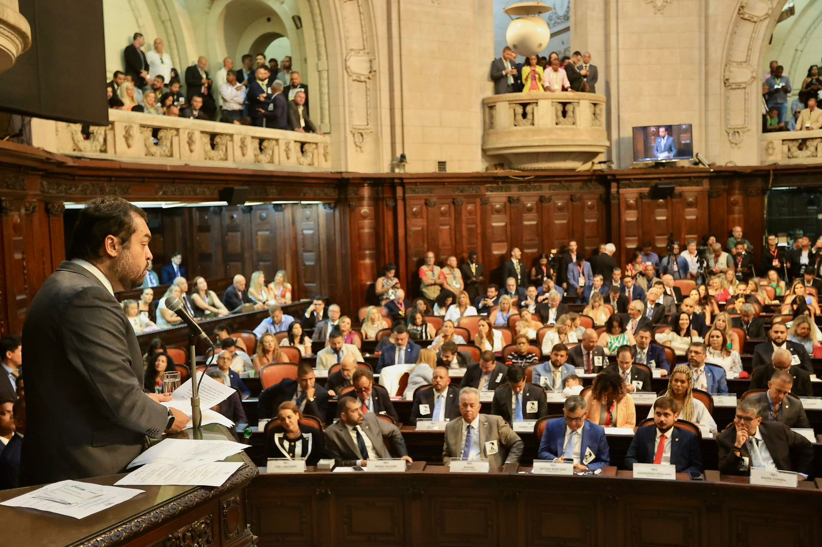 O governador Cláudio Castro participou na quarta, 1, da cerimônia de posse dos 70 deputados eleitos para a 13a Legislatura da Assembleia Legislativa do Estado do Rio de Janeiro (Alerj). Ele parabenizou os parlamentares e, em seu discurso, destacou a relação harmoniosa que deve existir entre o governo e a Alerj, além do papel fundamental que a Casa legislativa tem desempenhado para o desenvolvimento do Estado. Tem mais. Reafirmou o seu compromisso de dialogar com o Legislativo sempre em prol do Rio de Janeiro e da população fluminense e enfatizou que, ao longo de dois anos e meio de governo, a união de forças com a Alerj foi fundamental para o avanço de políticas públicas e conquistas para a sociedade.