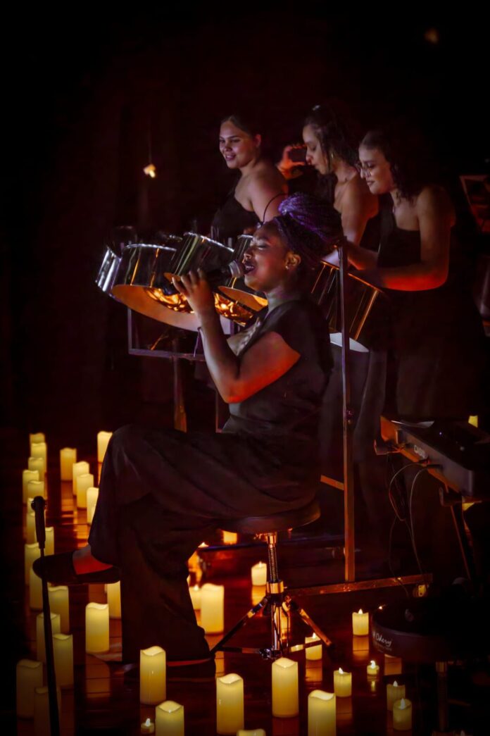 “Pensamos nesse espetáculo como uma forma de resgatar a essência da CSN, que é a produção do aço. Ao mesmo tempo, trouxemos essa concepção artística para o cenário, pois é a finalização do aço que permite a criação dos tambores, do som e das músicas”, explica Letícia Costa, coordenadora do grupo Tambores de Aço. As velas no cenário foram escolhidas por representarem o fogo, que remete ao processo de transformação do ferro-gusa em aço. “A partir disso, conseguimos unir o artístico com a realidade da produção do tambor de aço”, destaca.