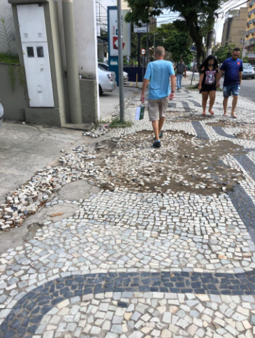 Rua 33 – Como levou calote da empresa que contratou para recuperar a calçada da Rua 33, toda ela de pedras portuguesas, como mostra a foto, a prefeitura de Volta Redonda passou a pressionar as empresas a arrumarem, elas próprias e às suas custas, a calçada em frente de suas lojas. Parece sacanagem. E é.