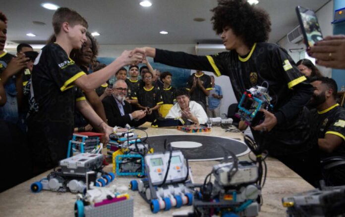 VISITA – Na tarde de ontem, quinta, 22, o prefeito Neto recebeu cerca de 60 estudantes da rede municipal de ensino, que participarão da etapa estadual do torneio de robótica nos dias 7 e 8 de julho, no Shopping Park Sul, em parceria com a Fira Brasil (Copa do Mundo de Robôs).