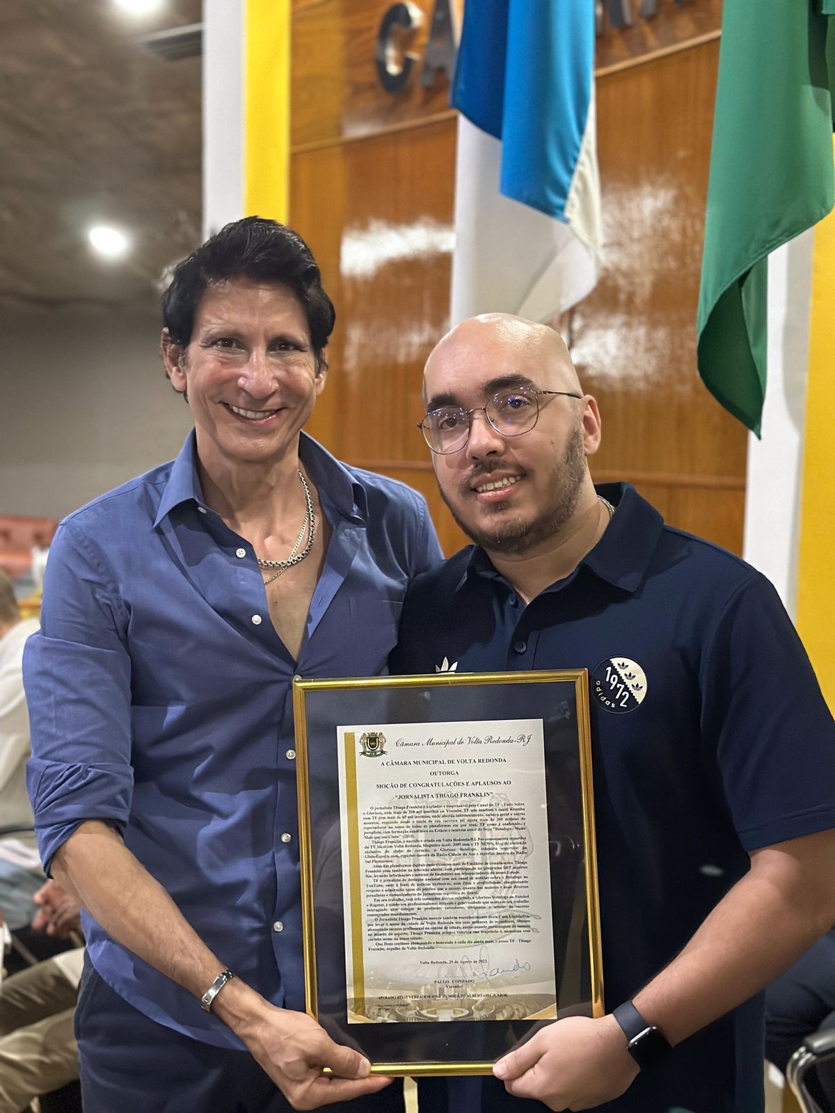 HOMENAGEM – A Câmara de Volta Redonda, por iniciativa do presidente da Casa, Paulo Conrado, aprovou uma moção de congratulações e aplausos ao jornalista Thiago Franklin, entregue a ele na sessão de quinta, 5. Nascido e criado em Volta Redonda, ele é jornalista de destaque nacional com seu canal sobre o Botafogo no YouTube. “O Thiago Franklin merece o reconhecimento desta Casa Legislativa, por levar o nome da cidade de Volta Redonda aos seus milhares de seguidores. Mesmo alcançando sucesso profissional na capital do estado, entrevistando personagens de sucesso no mundo do esporte, ele sempre valoriza sua trajetória e menciona com carinho o nome da nossa cidade”, justificou Conrado.