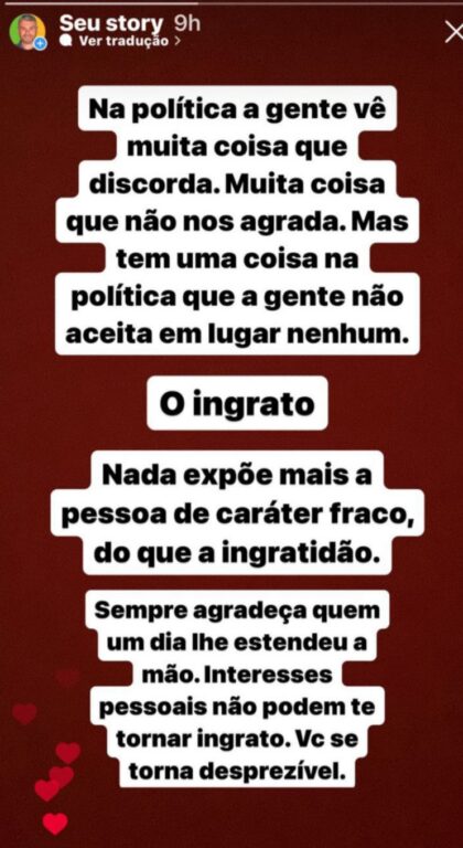 ELEIÇÕES (III) – Indagado se Munir seria o ingrato – ao lançar Darquinho à sua sucessão – da postagem enigmática (VER PRINT) que fez, Drable foi categórico. “Não, não é”, disse, sem revelar a quem se referia. “A mensagem é para o ingrato”, completou, generalizando a discussão. “Se eu quisesse colocar nome, teria colocado na postagem… Isso é sobre a ingratidão”, filosofou. “Não é uma pessoa específica sobre a qual eu queira falar…”, completou. “É sobre o sentimento ruim que fica sobre os ingratos…”, finalizou. Tá.