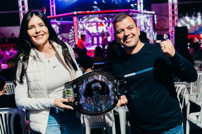 Fofo – Na noite de sábado, 13, durante o ‘Maximun Fight’, que agitou Barra Mansa, o prefeito Luiz Furlani se superou ao levar a primeira dama, Joseane Ricarte, para curtir as lutas de boxe, muay thai e MMA, disputadas no ringue montado no Clube Municipal. “Esporte é vida! E, em breve, seremos a cidade do esporte”, pontuou, todo sorridente ao entregar o cinturão de campeã à primeira dama. Foto: Yuri Melo