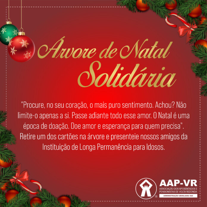 Símbolo de confraternização e afeto em família, o Natal também se tornou uma data marcada pela solidariedade. Fazer as vezes do Papai Noel já é uma tradição no Grupo de Ação Voluntária, da Associação dos Aposentados e Pensionistas de Volta Redonda (GAV). É, segundo os voluntários, extremamente gratificante. Este ano, o GAV terá, novamente, a campanha “Árvore de Natal Solidária”, que reúne pedidos dos idosos que vivem na Instituição de Longa Permanência para Idosos (ILPI) João Miguel da Silva, administrada pela AAP-VR.