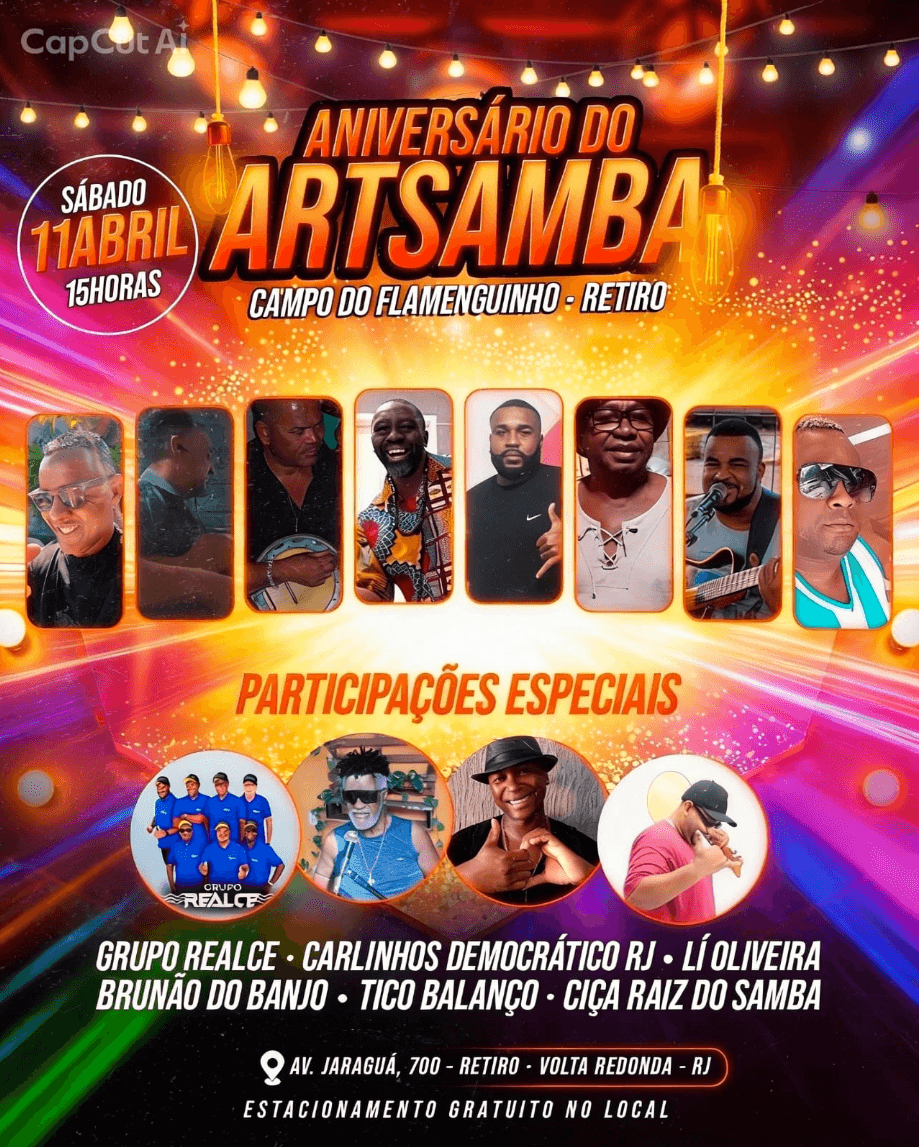 O Grupo ART Samba está comemorando o feito de há 45 anos estar produzindo samba raiz em encontros de sambistas na região e, neste sábado, 11 de abril, a partir das 15 horas, vai comemorar seu aniversário no campo do Flamenguinho, no Retiro, com a participação especial do grupo Realce, Carlinhos Democrático, Lí Oliveira, Tico Balanço, entre outros.