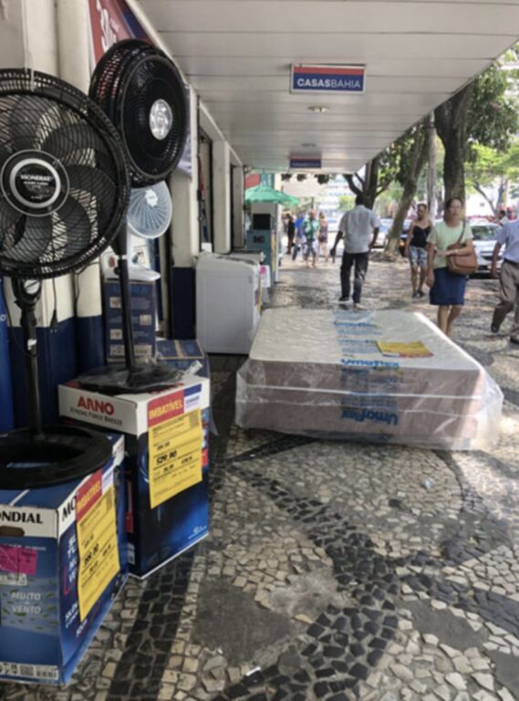 PODE? – A fiscalização da prefeitura de Volta Redonda anda pisando na bola ao permitir que a Casas Bahia utilize a calçada em frente à loja como área de exposição de produtos e coloque até colchão em cima do belo passeio, formado por pedras portuguesas. A reclamação é da leitora Maria Jéssica dos Alves.