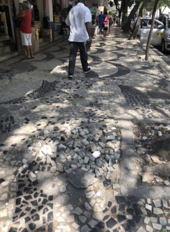 PEDRAS – Maria aproveitou para encaminhar outra foto para mostrar que a calçada na Rua 14, na Vila, utilizada como ponto de venda da loja de eletrodomésticos, está precisando de uma boa manutenção. “Mas que não troquem o piso pelos bloquetes de outras calçadas, como na 33, que são horrorosos”, comparou, em tom de súplica ao prefeito Neto para que conserve as pedras portuguesas da calçada da Rua 14.